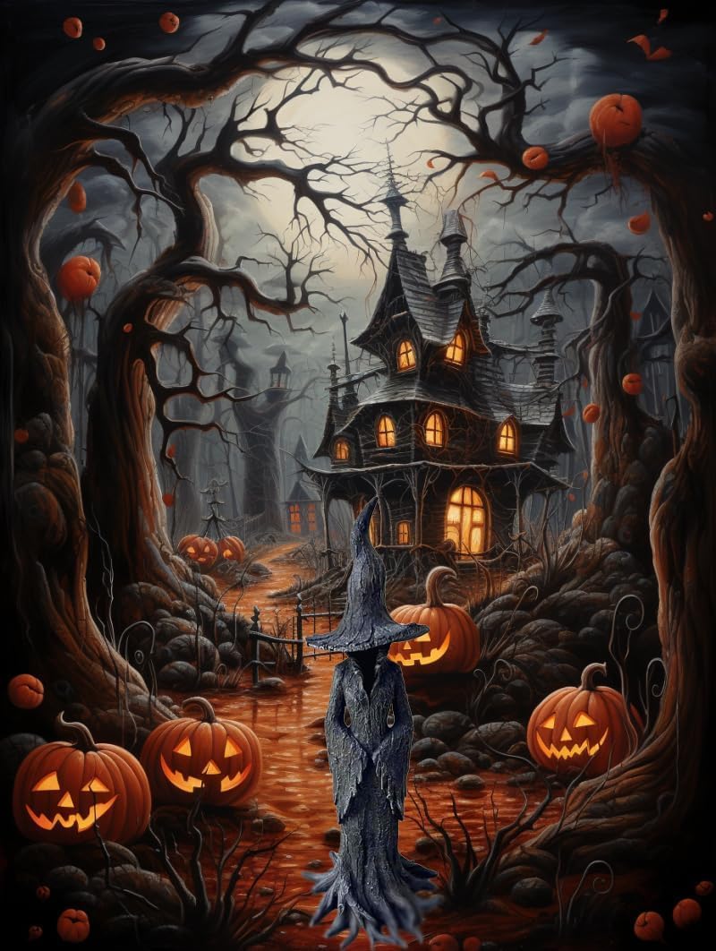 - 【Tree Root Witch Design】Features a uniquely designed witch with a flowing robe resembling gnarled tree roots and a tilted pointed hat, adding eerie charm to Halloween and fantasy-themed environments.