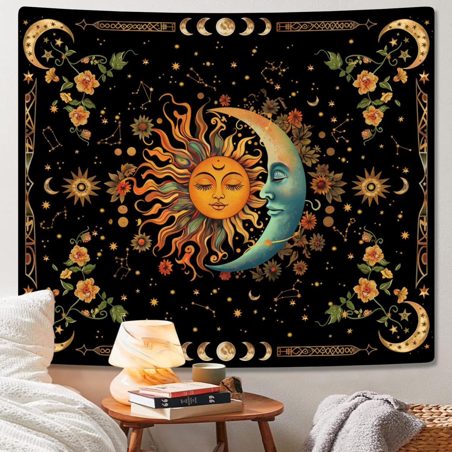 ARTCREATOR Sun and Moon Tapestry Astrology Space Wall Hanging Boho Hippie Floral Plant Tapestries Aesthetic Vintage Mandala Flower Decor for Living Room Bedroom (59" x 78")
