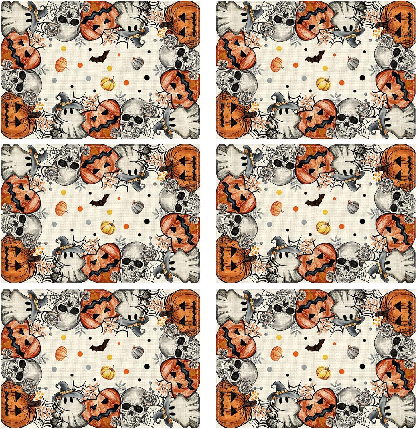 XCHI Spooky Skeleton Ghost Pumpkin Halloween Placemats Set of 6 Table Mats for Party Home Kitchen Dining Table Decorations 12x18 Inch