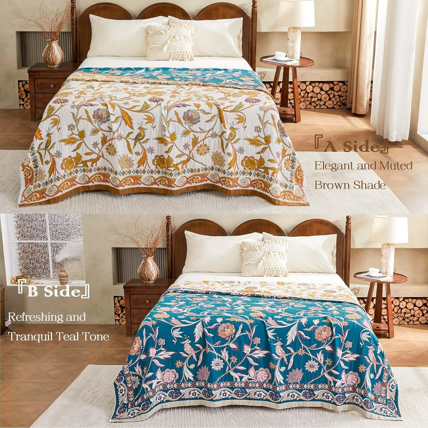Fall Throw Blanket for Couch, Brown Boho Decorative Throw Blanket, 100% Cotton Muslin Breathable Woven Farmhouse Blankets Quilt, 90"x98" Reversible Lightweight Blankets Bohemian Throw Quilt
