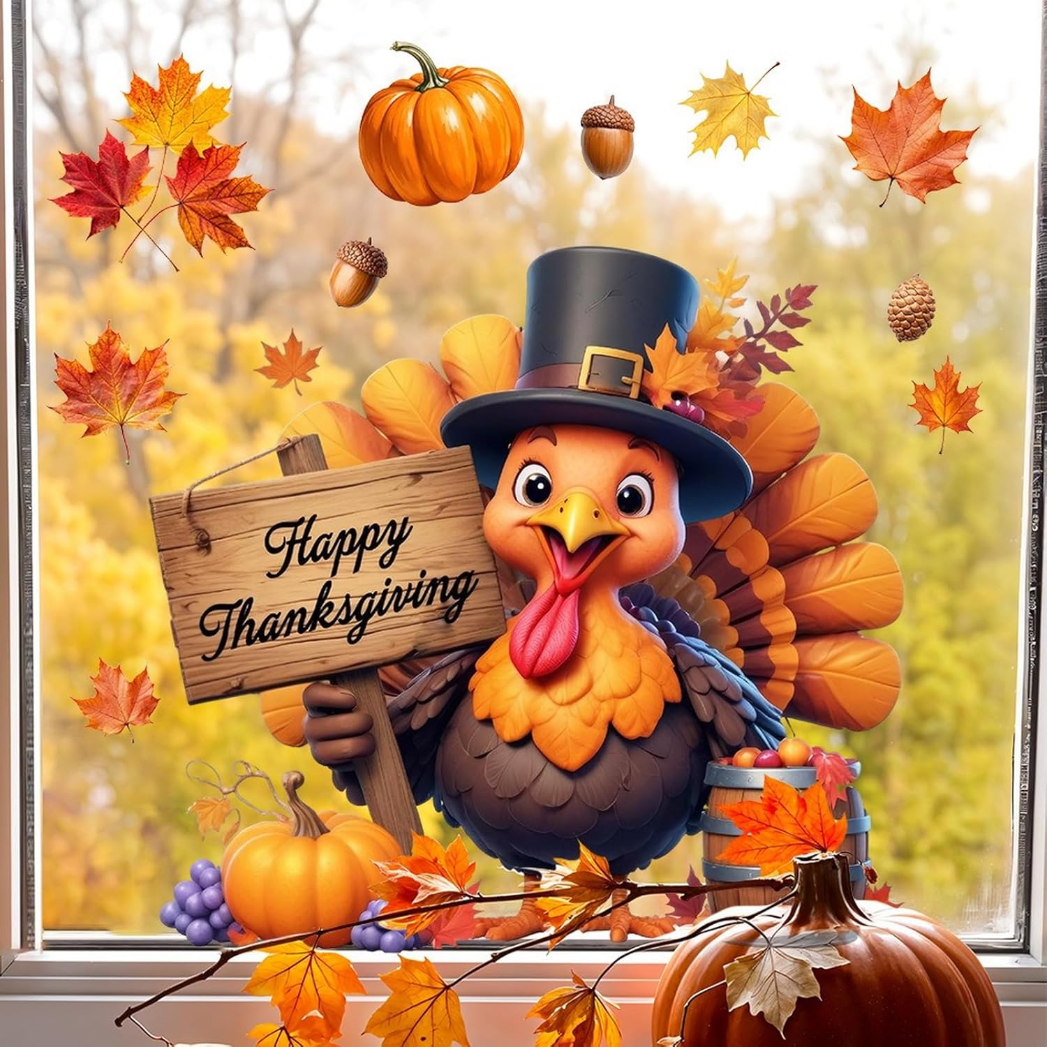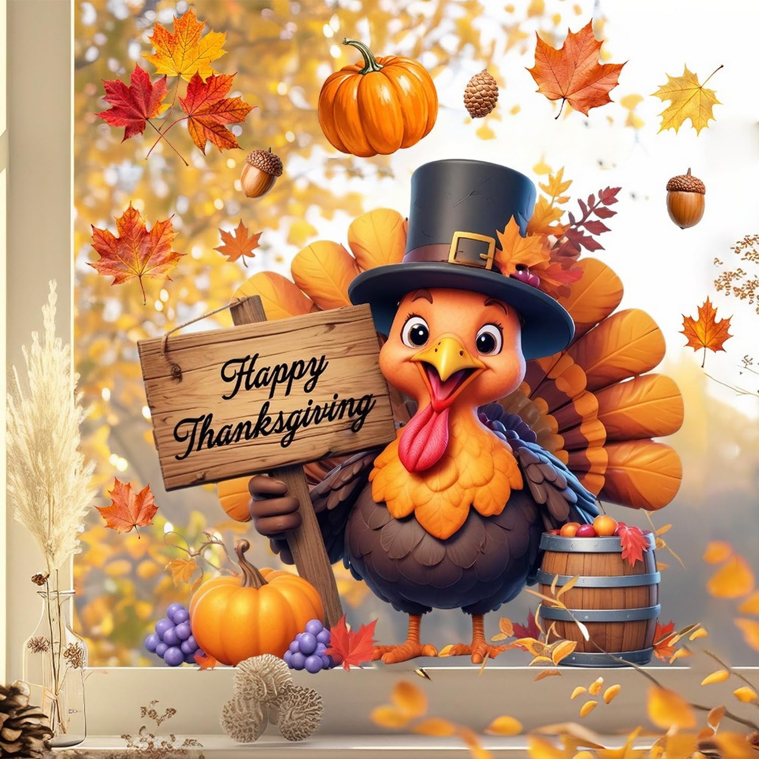 Fall Window Clings for Glass Thanksgiving Static Cling Window Decals 1PCS Turkey Pumpkin Maple Leaves Autumn Reusable Window Stickers Home School Office Decorations