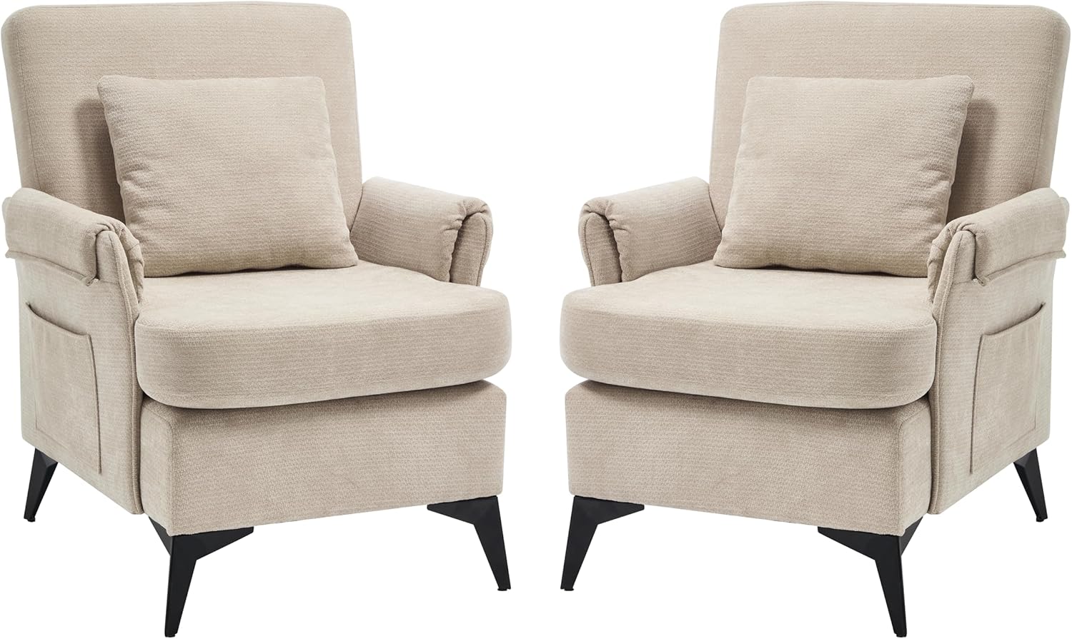 KCC Mid-Century Accent Chairs Set of 2,Chenille Modern Upholstered Single Sofa,Cozy Armchair with Back for Bedroom/Office/Cafe,Begie