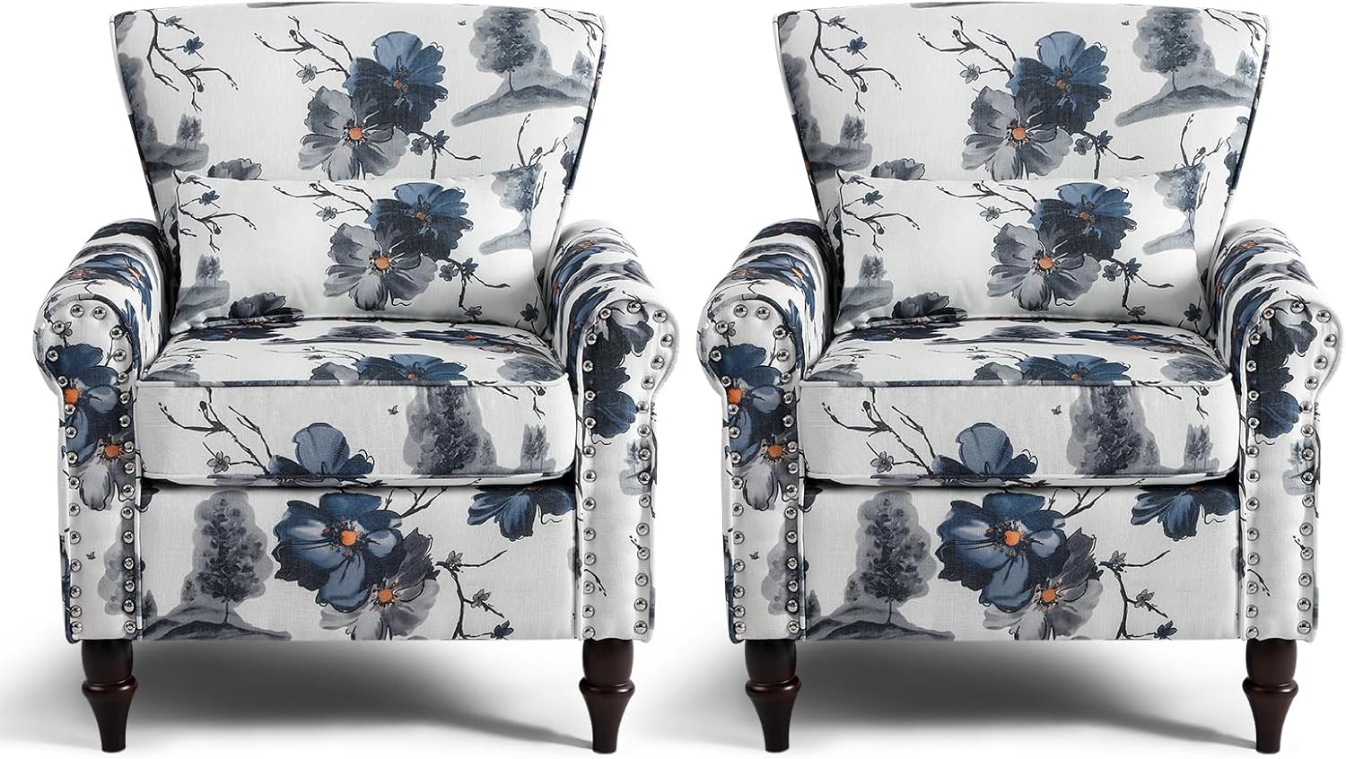 Wingback Accent Chair with Removable Pillow, High Back Floral Armchair with Solid Wood Legs & Nailhead Trim, Comfy Upholstered Reading Single Sofa Chair for Bedroom (2, Ink Blue Pattern)