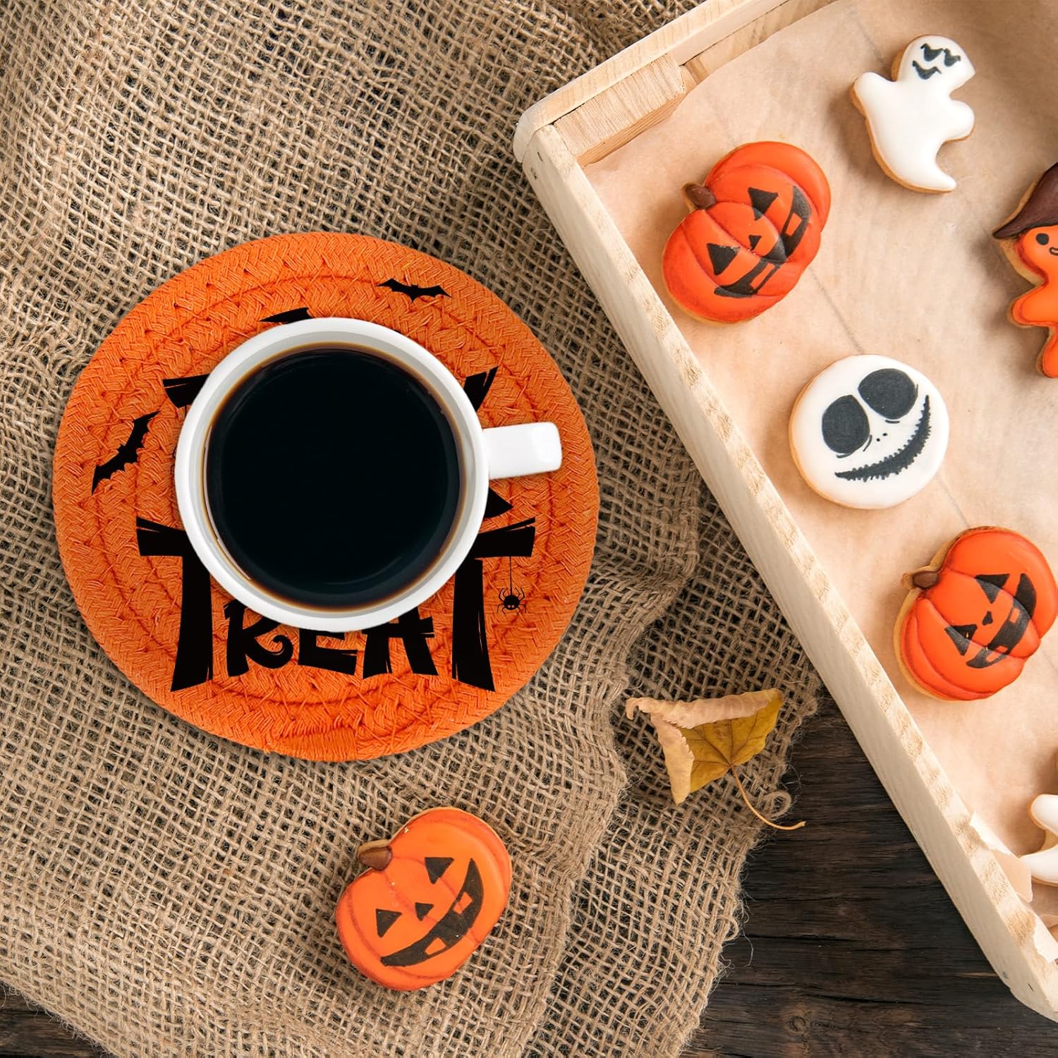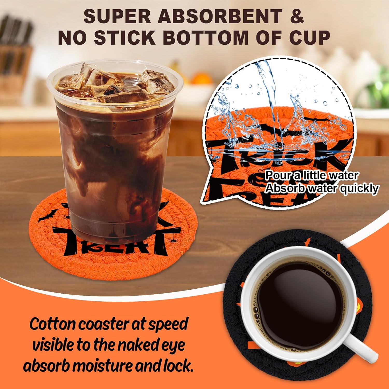 - Halloween Theme: Our cotton coasters are designed with pumpkin, bats and the words of âHAPPY HALLOWEENâ and âTRICK OR TREATâ, mainly colored in black and orange, classic and delicate, will nicely increase festive atmosphere