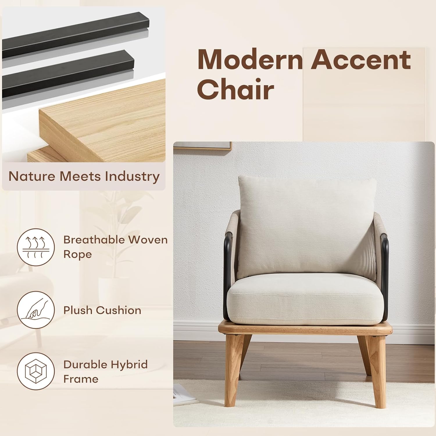 - Mid-Century Style: The modern sitting chair blends classic mid-century design with modern materials. Clean lines, open-frame silhouette, and angled legs reflect timeless retro charm. Built with a durable frame and weather-resistant rope, ideal for both indoor and outdoor use. Works great as a sitting chair in the living room, a reading chair in a nook, or a bedroom chair near a window