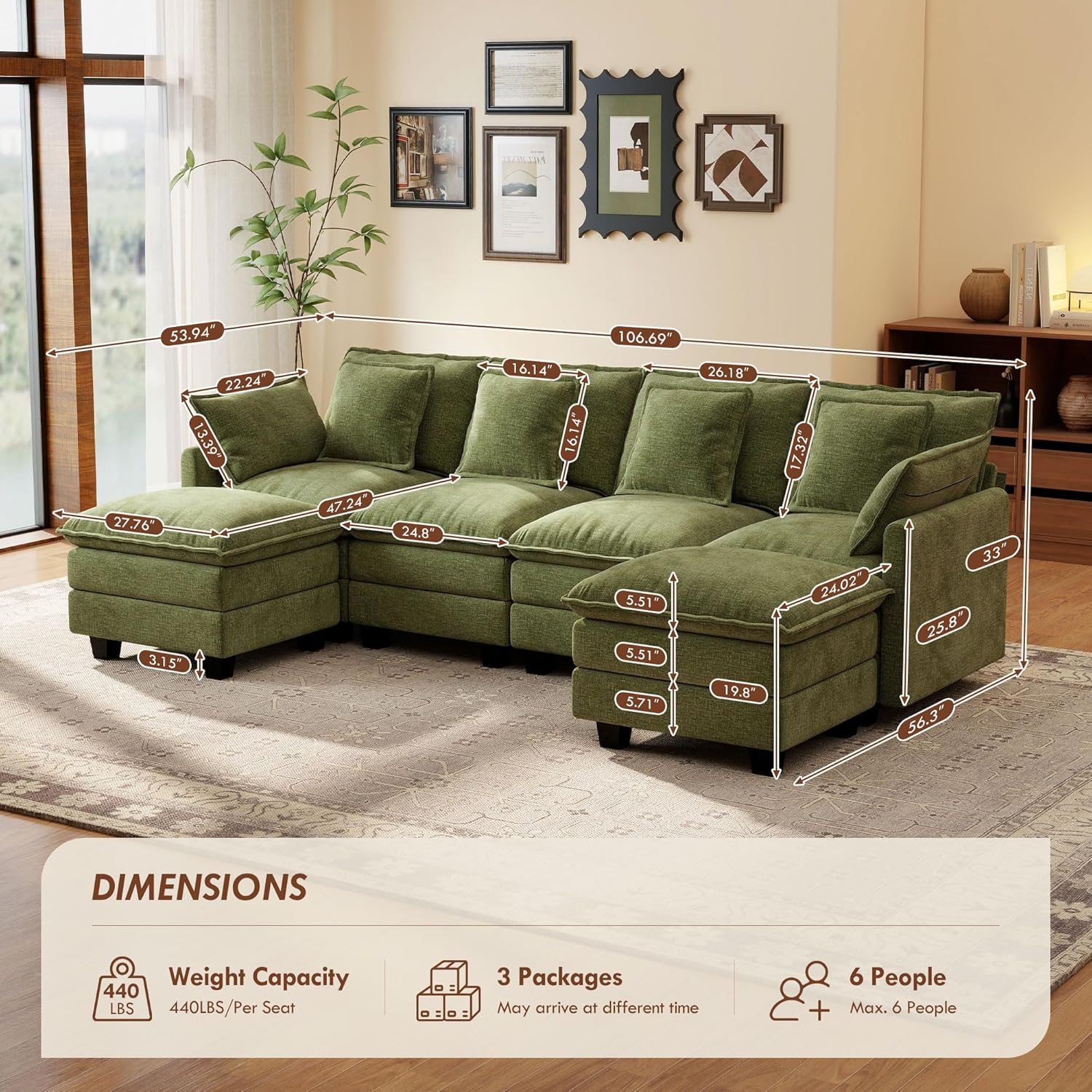 Ihanherry 106" L Shaped Modular Sectional Cloud Sofa, Modern 6 Seat Chenille Couch with Ottoman for Living Room, Bedroom and Apartment, Green