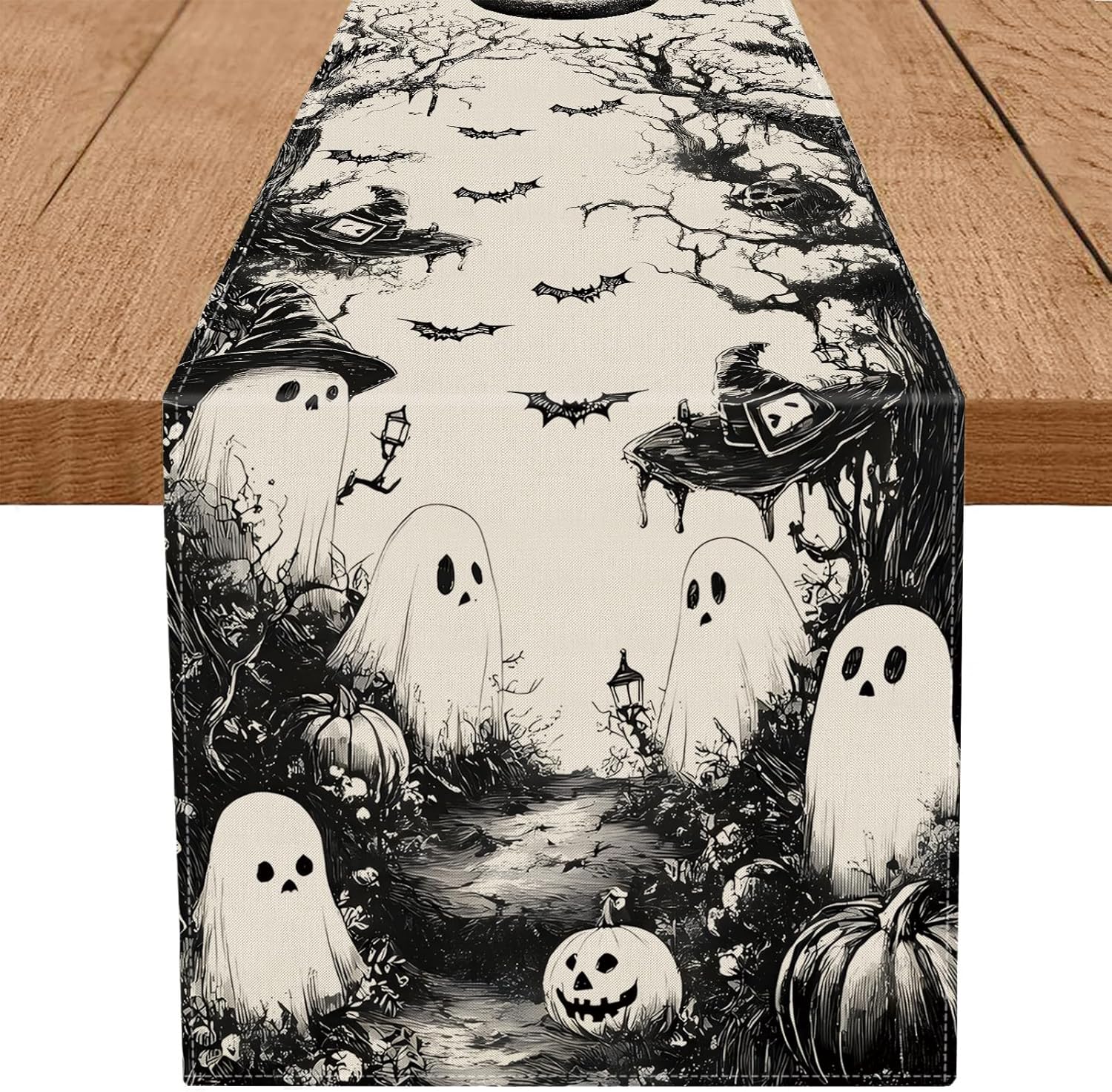 GPGHE Halloween Table Runner Black Ghost Holiday Burlap Table Decoration Indoor Outdoor Home Decor Party Supply 13 x 90 Inch