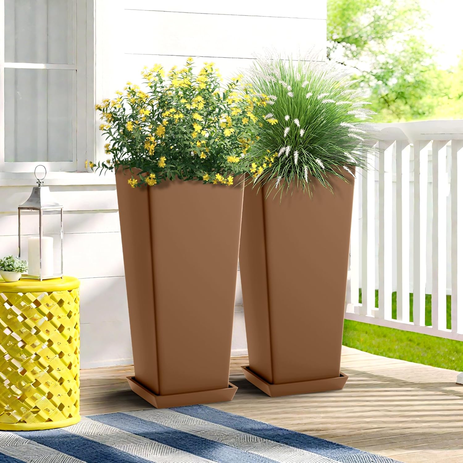 FENCY Set of 2 Tall Planters for Outdoor Plants, 24 Inch Large Tapered Pots with Drainage Trays, Weather-Resistant Plastic Plant Containers for Patio, Porch, Garden, Front Door Decor,Brown