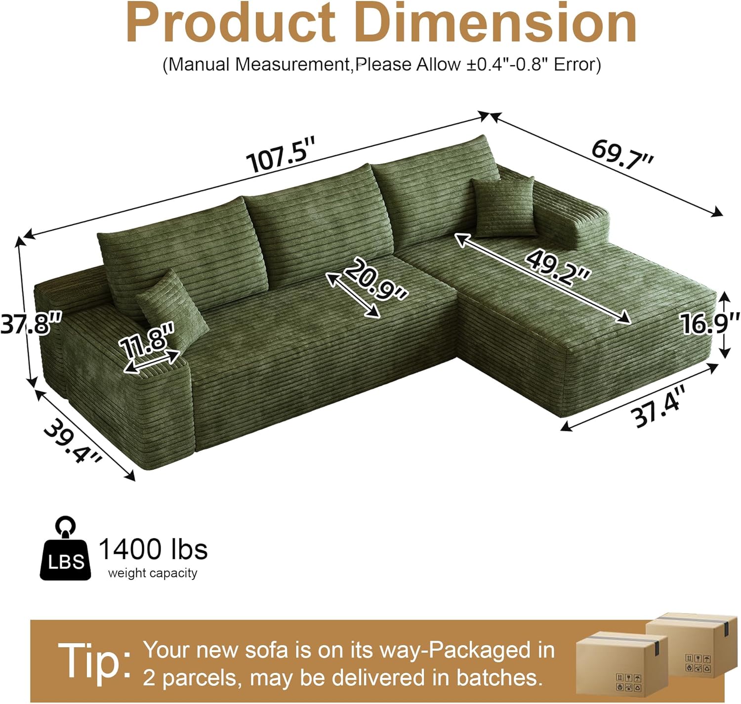 - Product Dimensions : 69.7"D x 108"W x 37.8"H