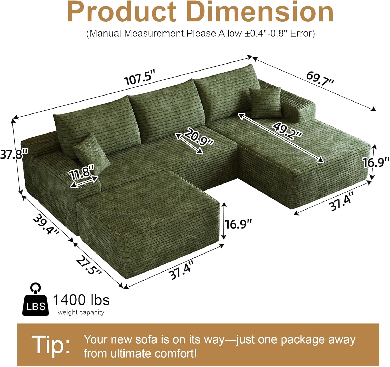 - Product Dimensions : 69.7"D x 108"W x 37.8"H
