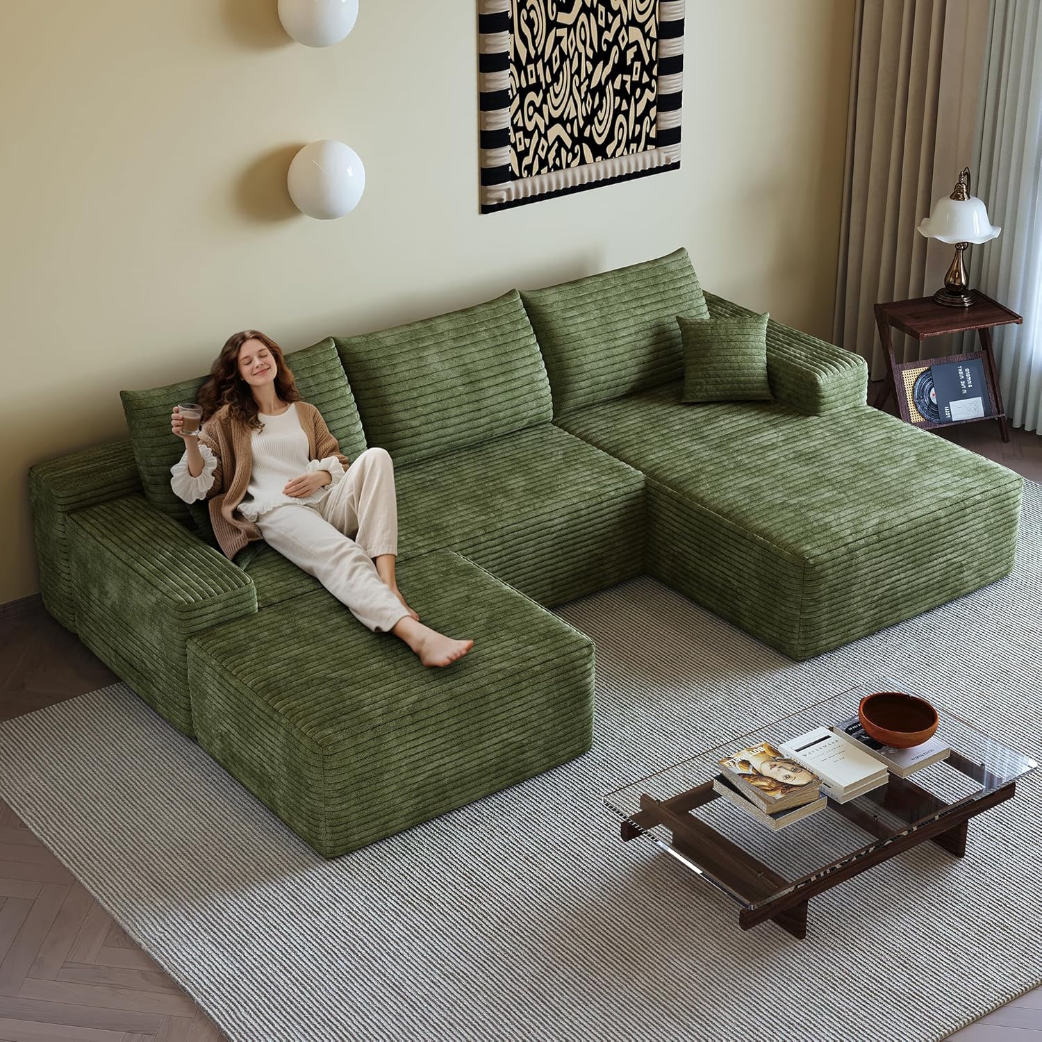 108" Sectional Couches for Living Room Modern Modular Sofa with L-Shape Couchs Upholstered Boneless Couch Deep Seat Sectional Couch with Chaise (Green, Right Facing Chaise+2Seaters+1Ottoman)