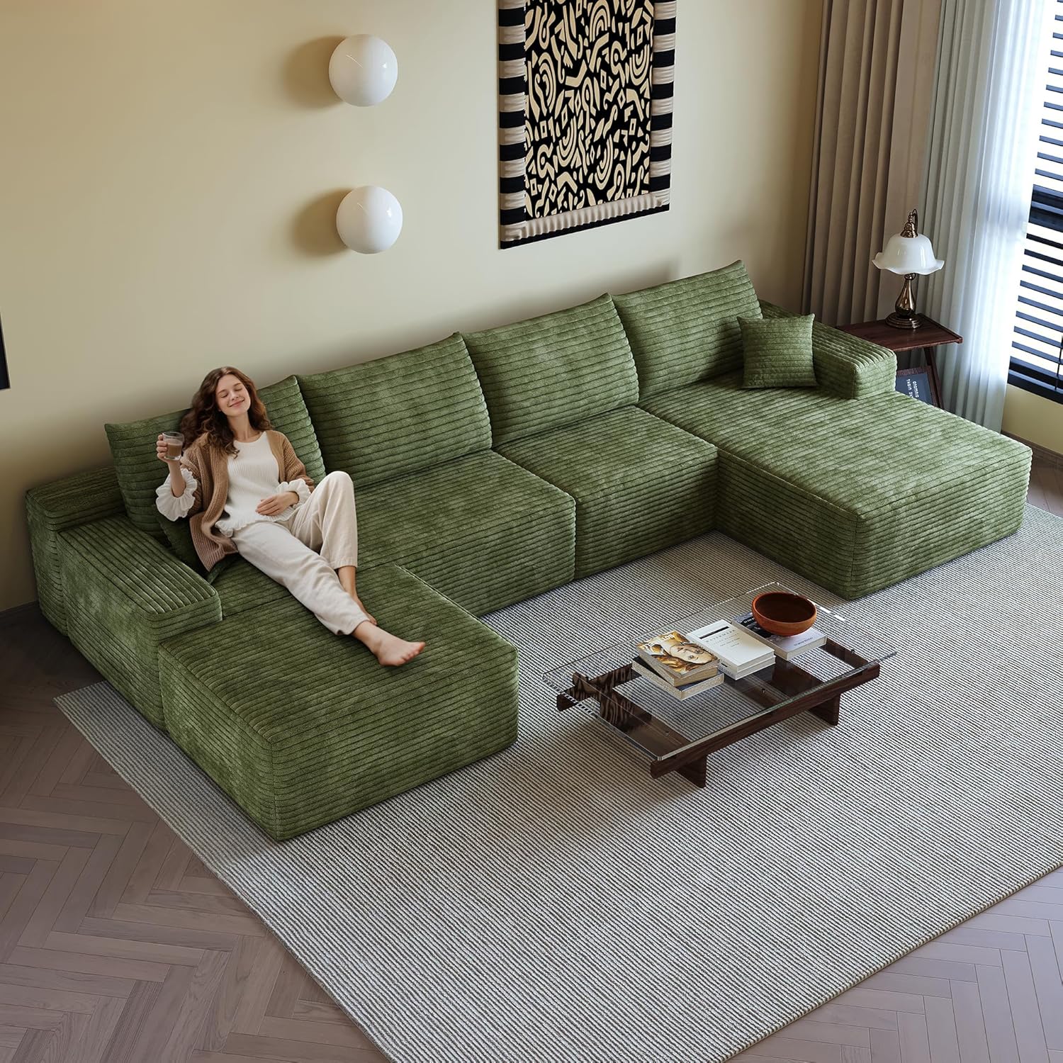 108" Sectional Couches for Living Room Modern Modular Sofa with L-Shape Couchs Upholstered Boneless Couch Deep Seat Sectional Couch with Chaise (Green, Right Facing Chaise+3Seaters+Ottoman)