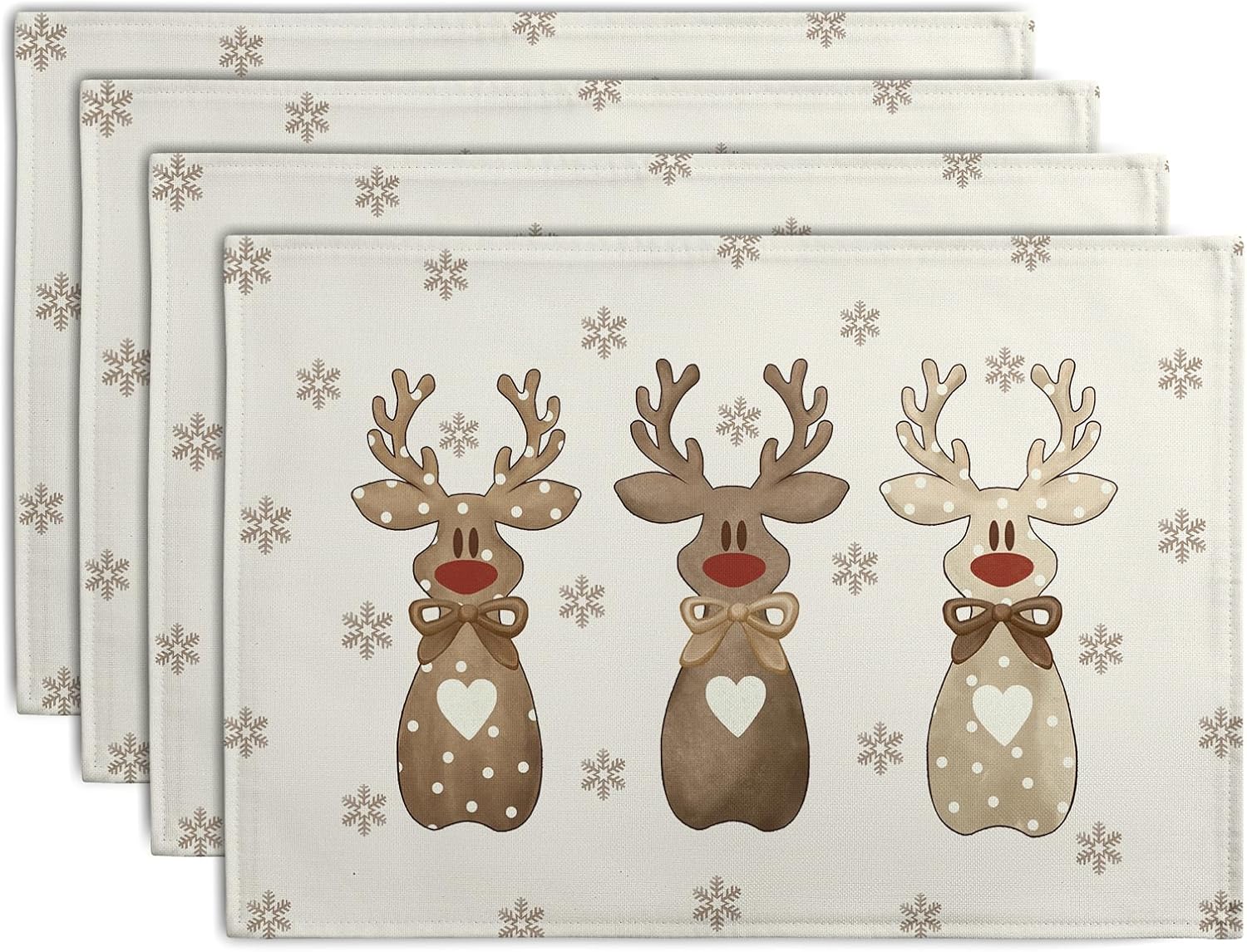 Christmas Reindeer Snowflakes Placemats Set of 4 Xmas Cute Elk Deer Place Mats 12x18 Seasonal Winter Holiday Farmhouse Linen Table Mats for Party Kitchen Dining Outdoor Indoor Decor