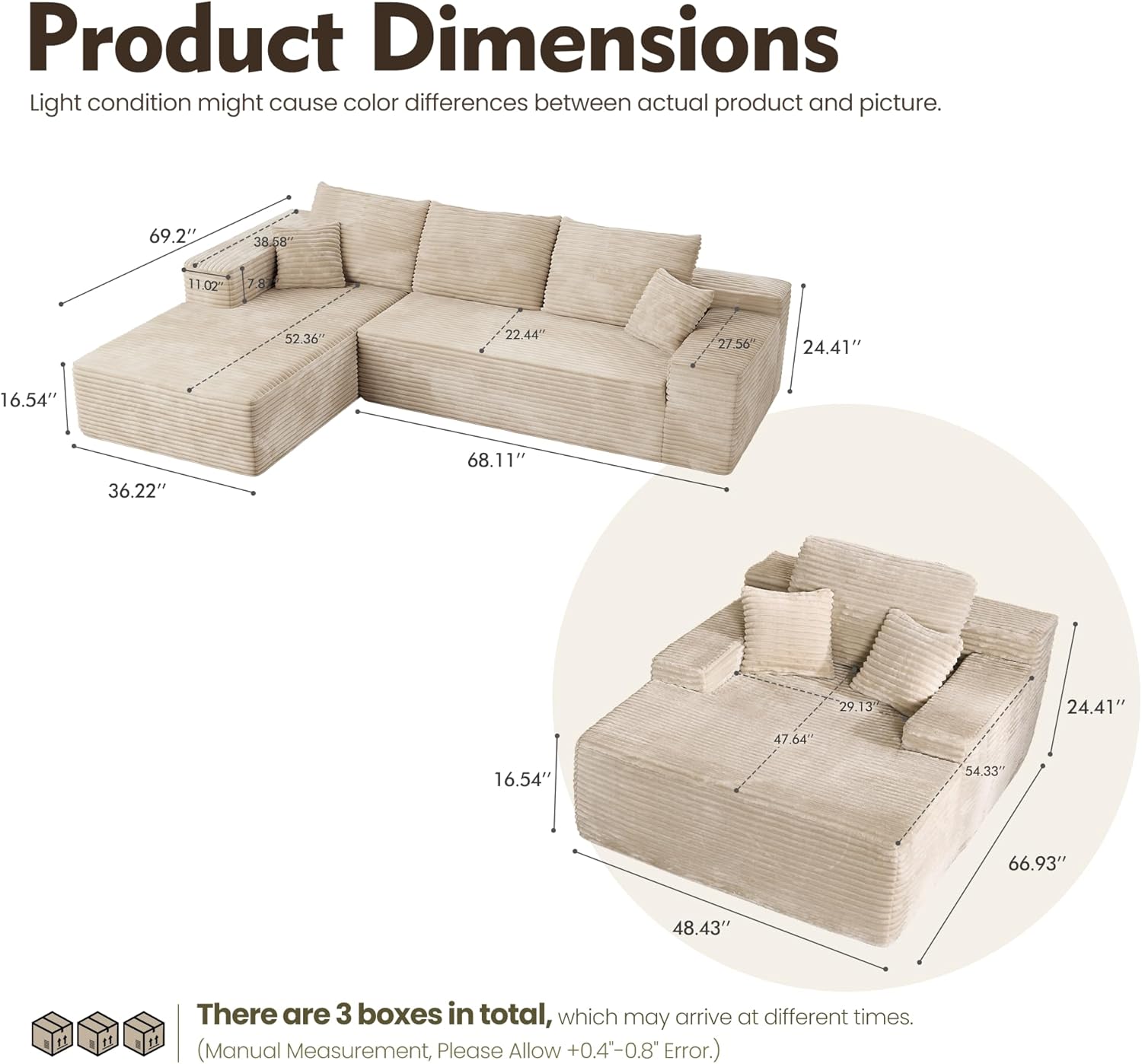 HOOOWOOO Cloud Sectional Couches for Living Room,Modular Sectional Sofa No Assembly,Plush Corduroy Large Floor Couch Furniture Set with Deep Seat Right L Shape and Chaise Lounge(Beige)