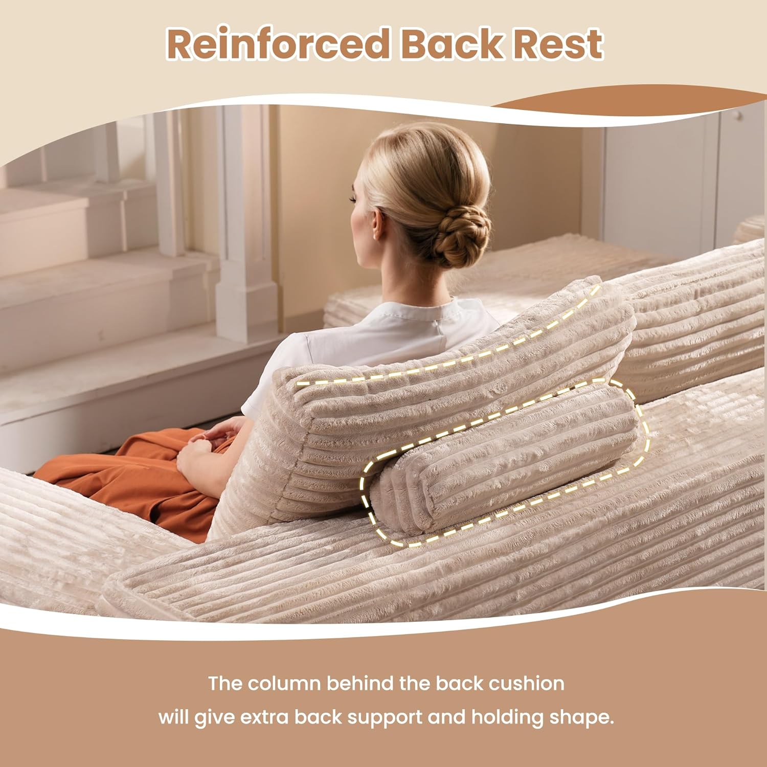 - Re-Enforced Back Support: Sepecially design a supportive back column behide the back pillow to re-inforce the back support and hold shape overtime