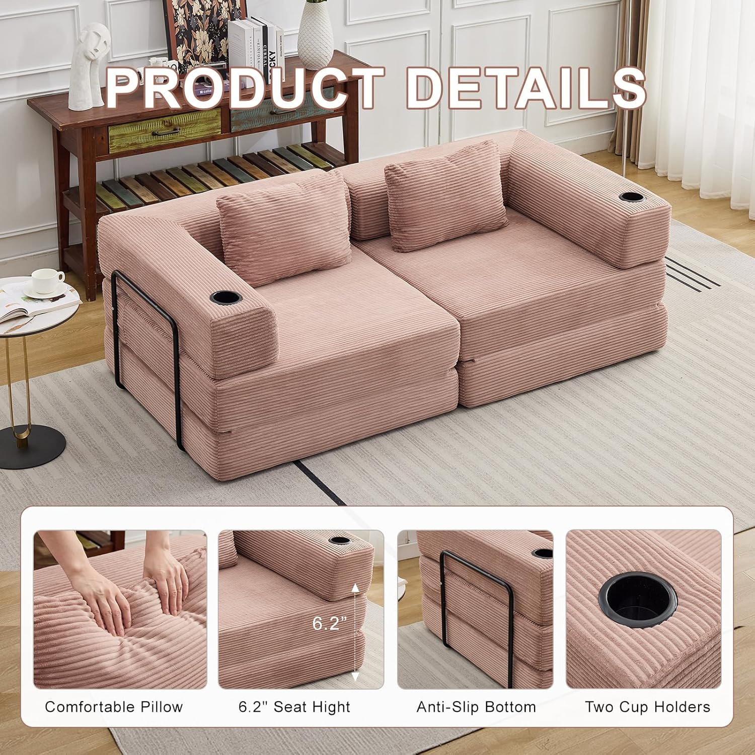 78" W Loveseat Sofa, 4 in 1 Convertible Floor Sofa Bed, Boneless Cloud Couch with Cup Holder, Fold Out Floor Couch, Loveseat Recliner Sleeper for Living Room Bedroom Lounge(Corduroy, White)
