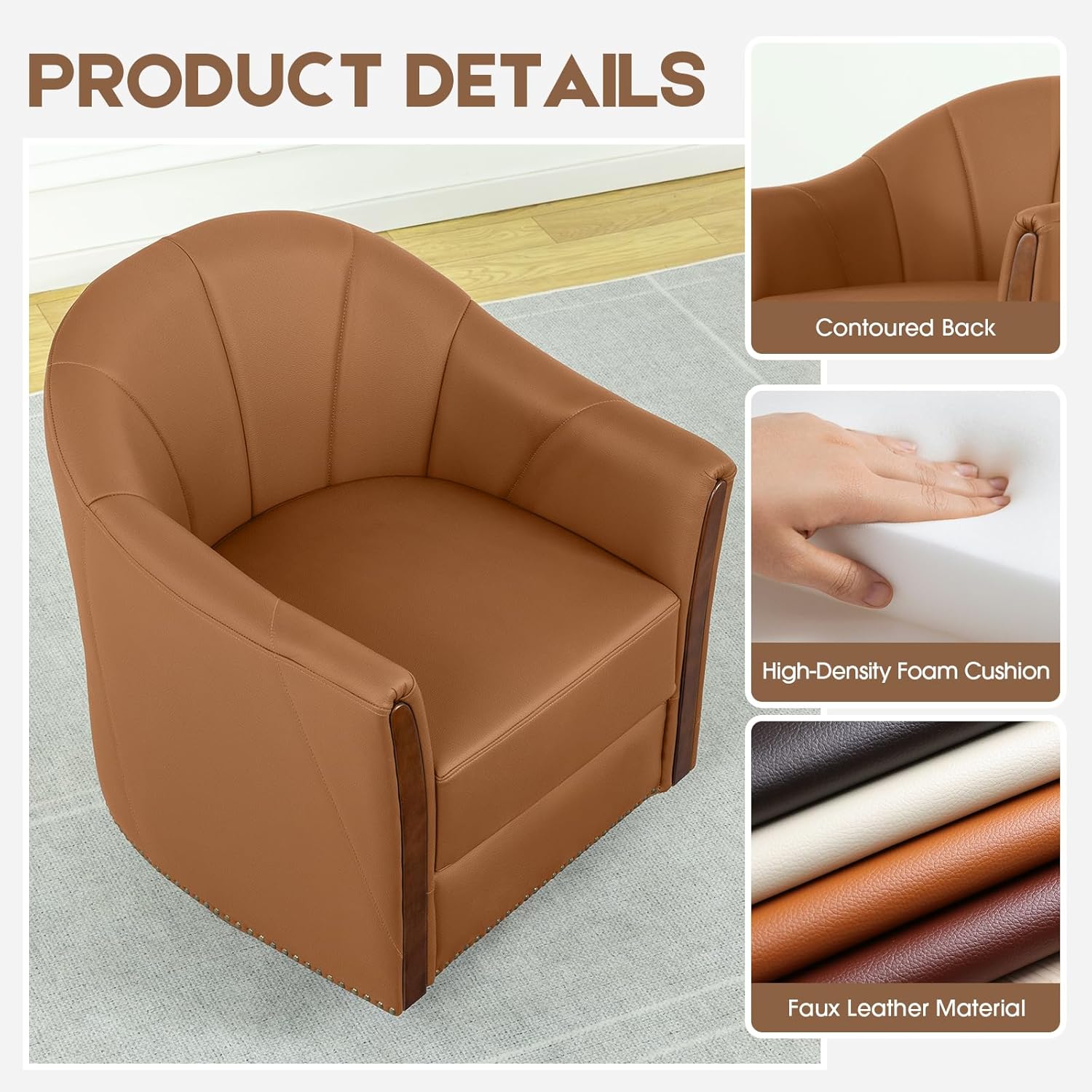 360° Swivel Accent Chair, Modern Leather Barrel Club Chair with Leather Upholstery and Sturdy Wood Base, Comfortable Armchair for Living Room, Bedroom, Reading Nook, Brown