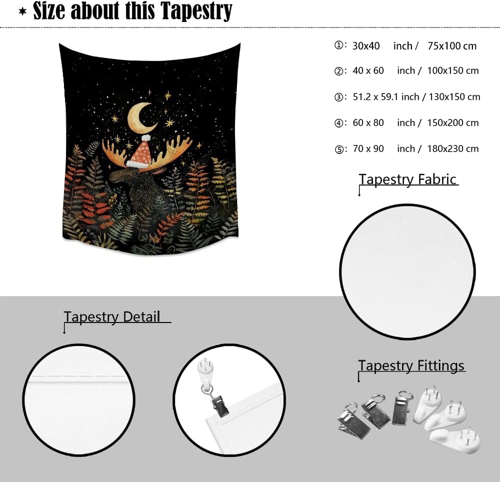 Cute Moose Tapestry Winter Christmas Aesthetic Wall Hanging Decor Funny Animal Lover Gift Whimsical Christmas Tapestries for Nursery Kids Bedroom Home Living Room Decoration 30x40inch