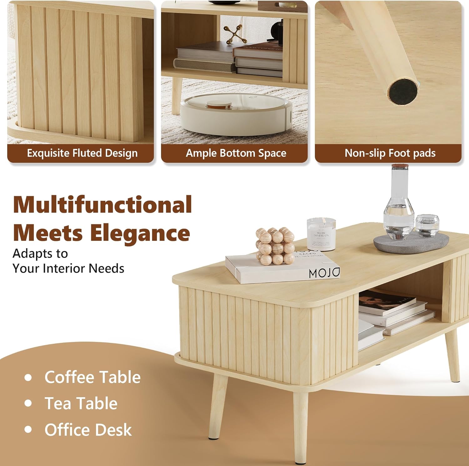 LAZZO Coffee Table with Storage Center Table for Living Room Rectangle Coffee Table with Rounded Edges,Easy Assembly, Natural Wood